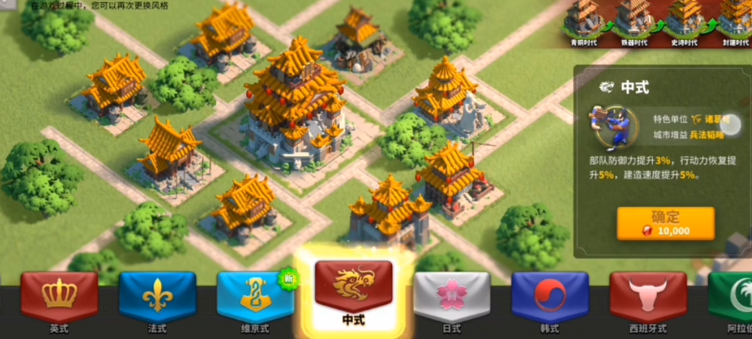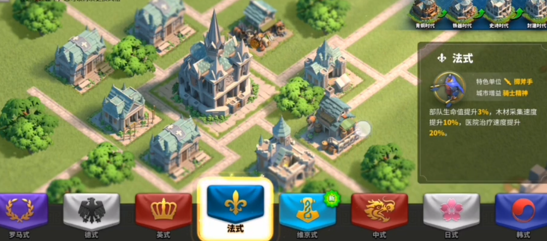 选择法兰西文明开局可直接获得史诗统帅贞德,其核心优势在于多功能性。贞德的技能上帝的启示能为友军提供步兵生命、骑兵防御、弓兵攻击的百分比加成,并加速怒气恢复,是团战和采集的强力辅助。法兰西文明的加成包括部队生命值+3%、木材采集速度+10%、医院治疗速度+20%,与贞德的辅助定位高度契合,适合前期平稳发育和中期团战支援。