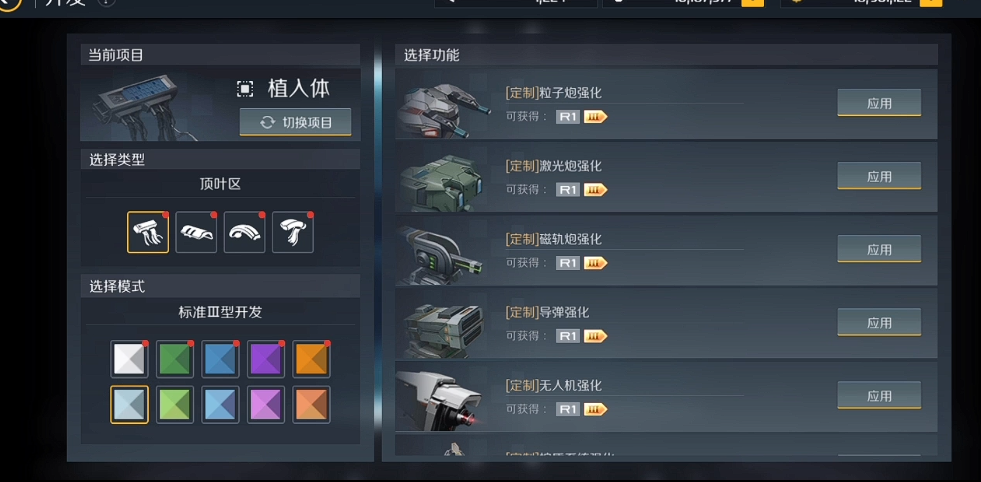 开发需要消耗低级植入体作为材料,通过一个R2和三个R1植入体可合成更高级的植入体,这种合成方式是提高评分的重要方法。更高级别的植入体也遵循类似的合成规律。开发过程可以跳过动画直接显示结果,提高了效率。不同区域的植入体提供不同方向的属性加成,如顶叶区强化武器相关属性,颞叶区增强护盾能力,额叶区提升能量系统,枕叶区则改善机动性能。