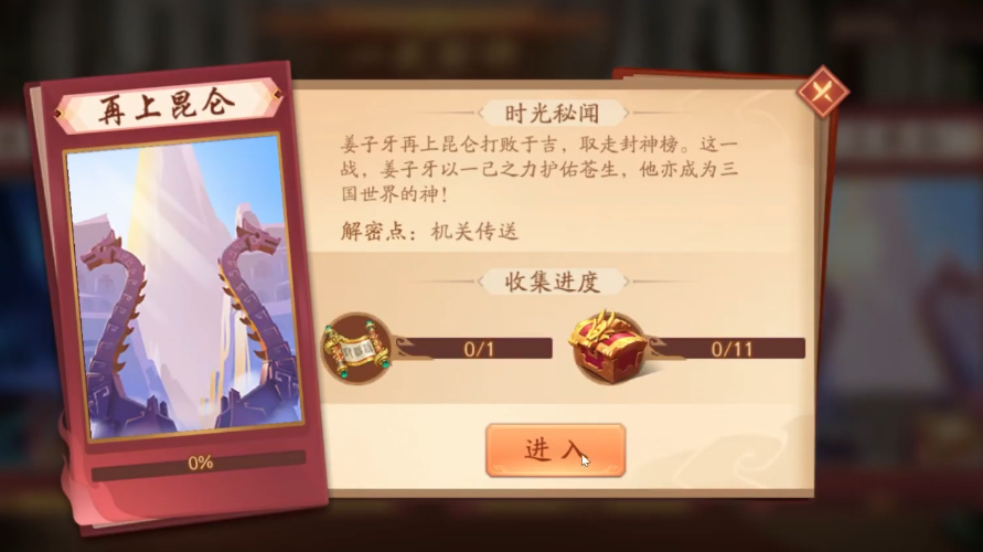 首先咱们得找到上昆仑的入口,这个副本藏得有点深,在主界面的意外发现里选择时空外传,然后点一战封神就能看到再上昆仑选项啦。进去之后先别急着走,耐心听完剧情对话,之后一直往上走会看到一个绿色机关,点一下就能把前面的尖刺路障消除掉。这时候继续往上会遇到红色传送圈,踩进去就能传送到新地图,路上遇到的敌人都要清理干净哦。