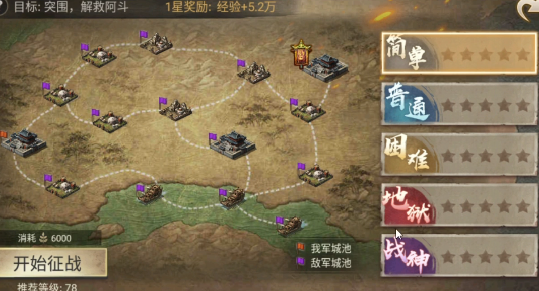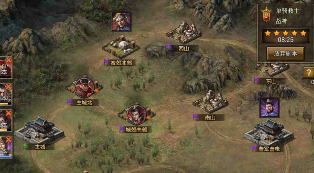 困难及以上难度需优先攻占曹军营帐,该据点会定时派出增援部队阻碍行军。建议使用司马懿快速突进营帐投放2-3个影子牵制敌军,同时分兵处理其他路线。地狱难度新增解救甘夫人事件,但奖励领取会降低攻防属性,应留待最后阶段处理。战神难度则需放弃解救事件,集中兵力速攻主城水域,利用觉醒关羽的战法快速清理长坂坡守军,同时分派三将走东山-西山路线形成夹击之势。