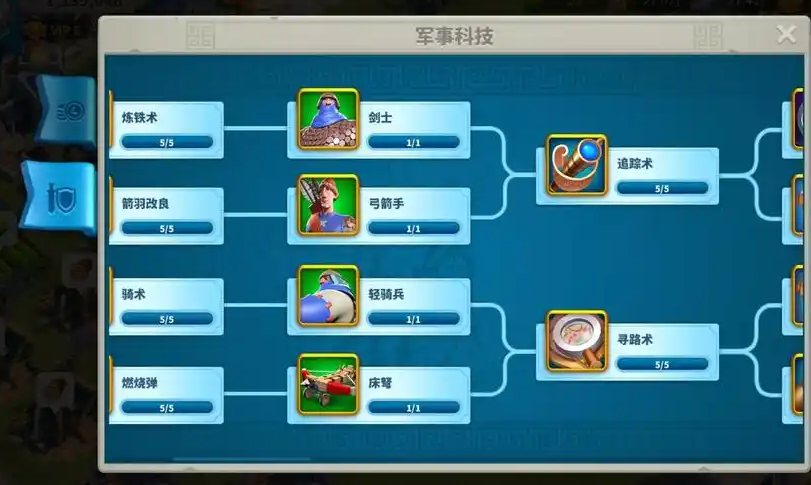 科技研究这块更是重头戏,咱们得先把农业科技全部点满,T4兵种也得全部解锁。军事科技里的大三围和小三围必须全部拉满,这些术语听起来复杂,其实就是指那些提升兵种属性的关键科技。比如步兵对应的乌兹钢和长鳞盾、弓兵对应的锥形箭和巨盾、骑兵对应的马镫和板甲,这些都得研究到顶。制图学也得点满,不然连解锁T5的资格都没有。