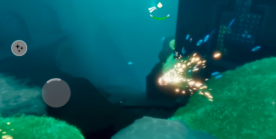 潜水时要注意氧气条哦,它在光翼图标下方显示为蓝色。氧气会随着时间减少,如果耗尽了就会开始掉翼,所以别在水下待太久。看到蓝色气泡或者光蘑菇记得靠近,它们能帮你恢复氧气和能量。海底还藏着烛火可以收集,游过去碰一下就能拿到,攒多了能合成蜡烛呢。