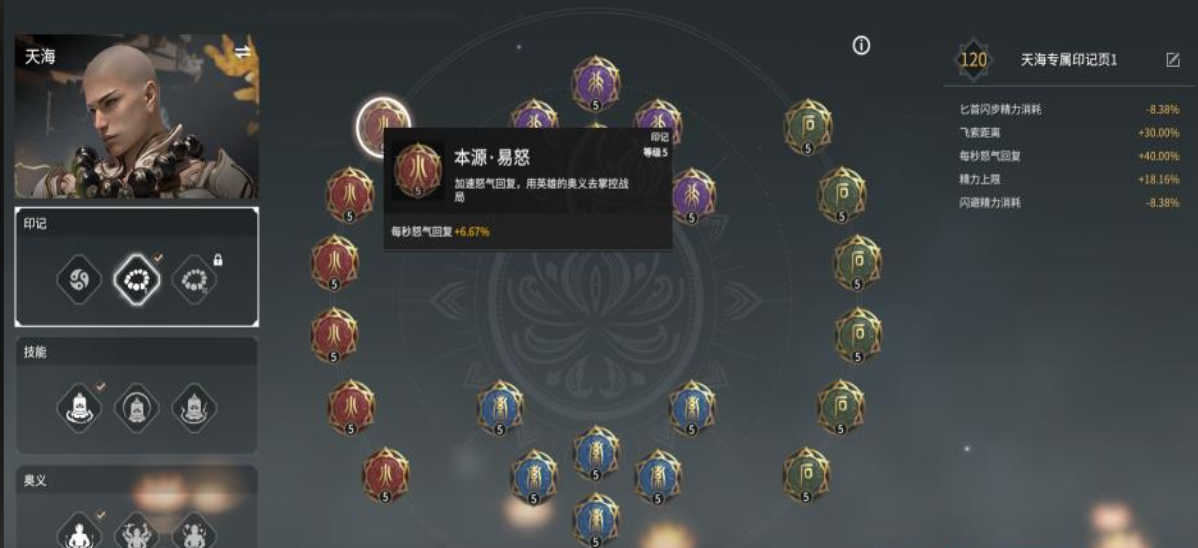 天赋印记系统是角色强化的核心机制之一,通过合理搭配可显著提升战斗表现。天赋分为本源(红)、极阴(紫)、极阳(蓝)、万物(绿)四类,每类最多装备6个印记,需根据英雄特性与战斗风格选择。本源印记优先考虑易怒(提升怒气恢复)与体能(增加精力回复),极阴推荐暴怒(伤害转怒气)或灵巧(降低闪避消耗),极阳侧重神索(飞索距离)和急速(技能冷却),万物则以顽石(精力上限)和水润(治疗增强)为主流选择。印记需消耗古币升级至5级,建议优先投资关键属性。