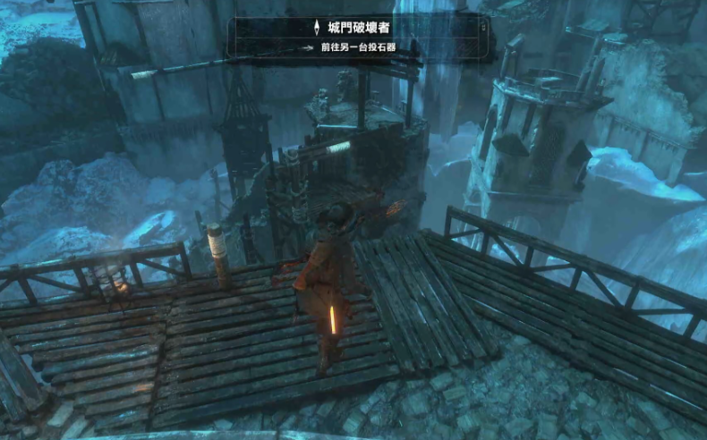 继续前进会遇到另一个大厅,这里会出现三个敌人,之后还有两个增援,烟雾弹用完后又会出现两个重甲敌人。建议拉开距离用汽油弹或者破片手榴弹解决,别硬拼。绕回原本的大厅后,二层绳梯有两个敌人,地面还有一个持盾的,这时候可以用爆炸物或者远程武器搞定。爬上二层后,沿绳索滑到大门右侧,用绞索让铁桶装水拉断起重机,最后一段跑酷就能进入大门了。