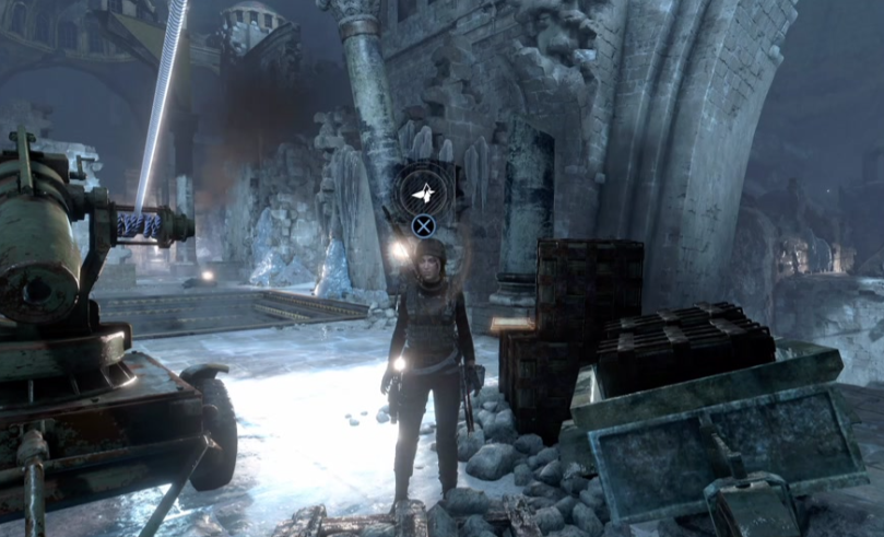 往前走一点会到达神庙回廊大本营,这里可以升级技能和装备,建议好好准备一下,因为前面的遗迹敌人比较多。大厅里有两个背对的敌人,用烟雾弹暗杀最稳妥。右拐角还有四个敌人,提前准备好烟雾弹,找准时机再出手。接着右转沿着绳索爬到大门前,这里需要解决左右两条线的机关才能拉开大门。左侧的机关需要滑到卡车上,再爬上石桥,用绞盘和手推车把卡车撞落,拉断绳索。