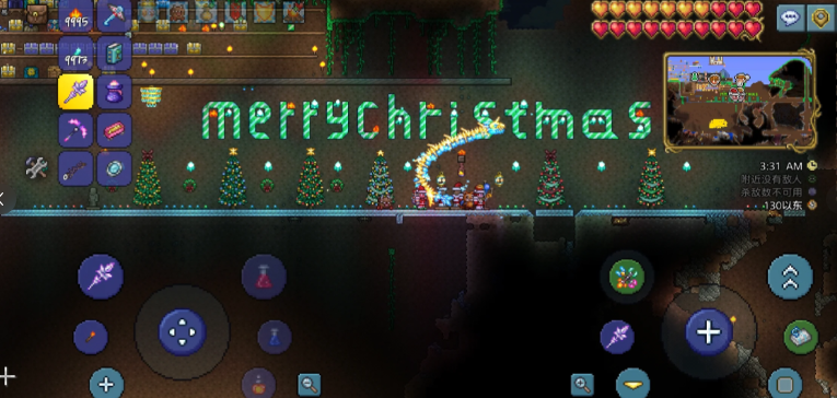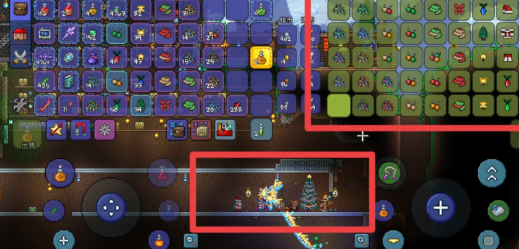 圣诞节事件被成功召唤后,游戏世界会产生一系列直观的变化。最显著的标志是,所有自然生成的敌怪(雕像召唤的除外)都有约1/13的概率掉落礼物盒。地图上刷新用于恢复生命的心形会被糖棒取代,而恢复魔力的魔力星则会被蜜糖李替代,它们都带有鲜明的节日特色。整个世界会飘落雪花,呈现独特的圣诞景观,这些环境变化共同营造出浓厚的节日氛围。