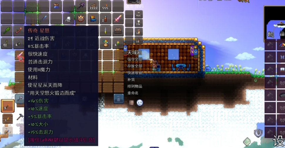 追求上述后期神器并不现实,但存在一些获取门槛相对较低、却能有效帮助度过开荒阶段的强力装备,新手可以优先考虑。星怒可以通过探索天空岛上的宝箱获得,而迷你鲨则可以直接从军火商处购买。这些武器虽然无法与毕业级神器相比,但其性能在游戏前期非常突出,能帮助玩家更顺利地击败首个机械BOSS,为进入困难模式打下坚实基础。
