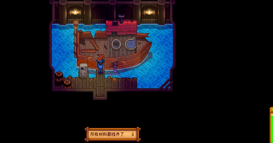 在收到威利的信件后,你需要前往位于沙滩的威利鱼店,此时店铺里屋那扇通常关闭的后门可以打开。进入后院,你会看到一艘破损的船只,修复它是前往姜岛的唯一途径。修复所需材料为200个硬木、5个电池组和5个铱锭。硬木需要通过升级后的斧头砍伐农场或秘密森林中的大木桩获得;电池组需要依靠在雷雨天气中工作的避雷针来收集;铱锭则通过冶炼铱矿石制成。将全部材料交付用于修复后,船只将在次日准备就绪,之后你可以花费1000金币在鱼店后院的售票机购买船票,乘船抵达姜岛。